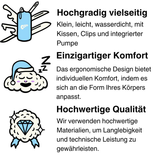 Der außergewöhnliche Komfort und die hohe Widerstandsfähigkeit deiner Luftmatratze COZIYA sind das Ergebnis hochwertiger Materialien (40D+ Nylon, doppelte TPU-Schicht) und eines durchdachten ergonomischen Designs – inklusive einem integrierten U-förmigen Kissen und 10 cm dicken Polsterzonen.