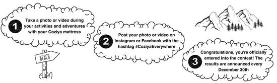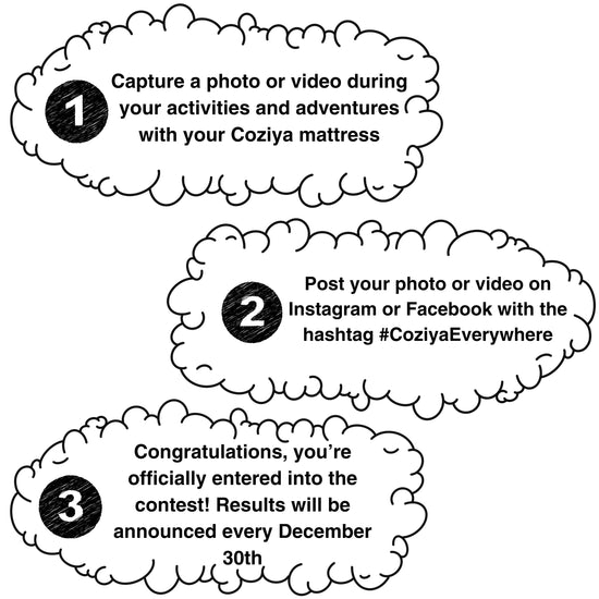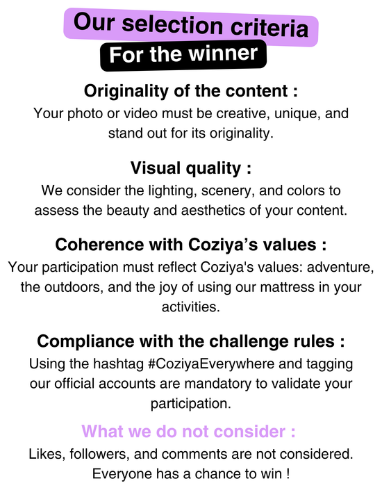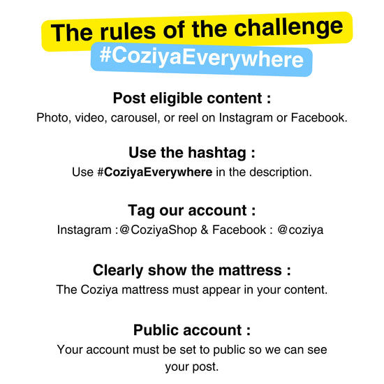 All types of content posted on Instagram and Facebook are accepted: videos, photos, carousels, reels, etc. As long as the Coziya mattress is visible and your post meets the criteria with the hashtag, your participation will be considered! Only stories are not eligible, as we will not be able to review them on the day of selection, and they do not appear in the hashtags.