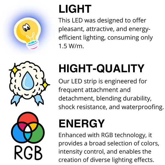 Your LED strip incorporates RGB technology, offering a wide range of colors, allowing you to regulate light intensity and create a multitude of lighting effects.