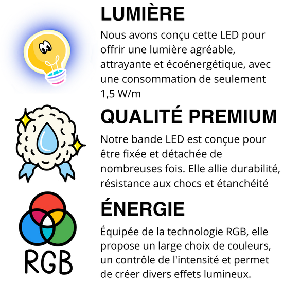 Votre bande LED intègre la technologie RGB, offrant une vaste palette de couleurs, permettant de réguler l'intensité lumineuse et de réaliser une multitude d'effets lumineux.